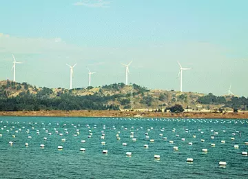 汕尾风车岛海水清澈透明,自然景光十分迷人,岛上风车群是广东省内为数不多的风力发电群。雪白的风车与连绵的山、蔚蓝的海构成了整个优美的画面,风车高大,十分宏伟。