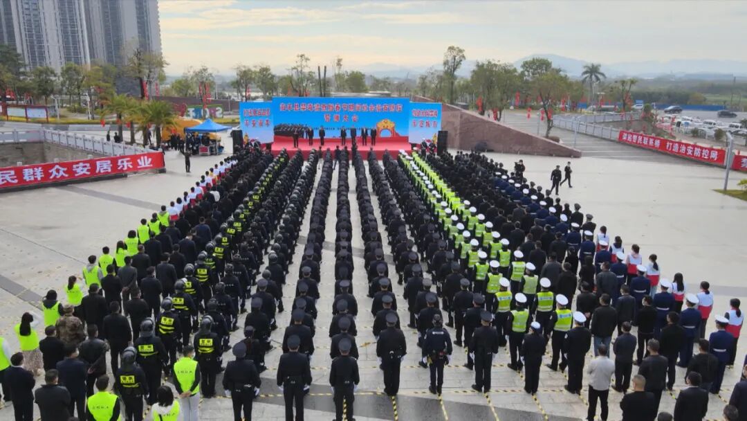 海丰县禁毒清查暨春节期间社会治安防控誓师大会在市民广场举行,旨在深入推进“全民禁毒工程”“禁毒示范城市创建”“平安海丰”三项工作,全力打造“无抢无盗、无黑无恶、无毒无枪、无假无骗,让老百姓无忧无虑”的良好社会治安环境,确保全县人民度过一个欢乐、祥和、喜庆、平安的春节。