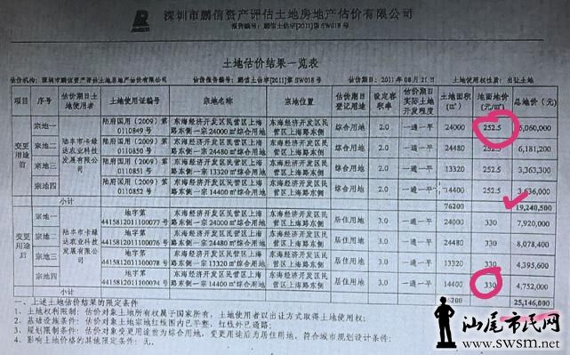 而就在此前的一天,2011年8月21日深圳市鹏信资产评估土地房产地产评估价格有限公司出具土地评估价格,在上述四块土地变更用途前,评估地面价格每平方米252.5元,总地价为1924万余元,变更“居住用地”用途之后,评估地面价格每平方米330元,总地价变成2514.6万元。