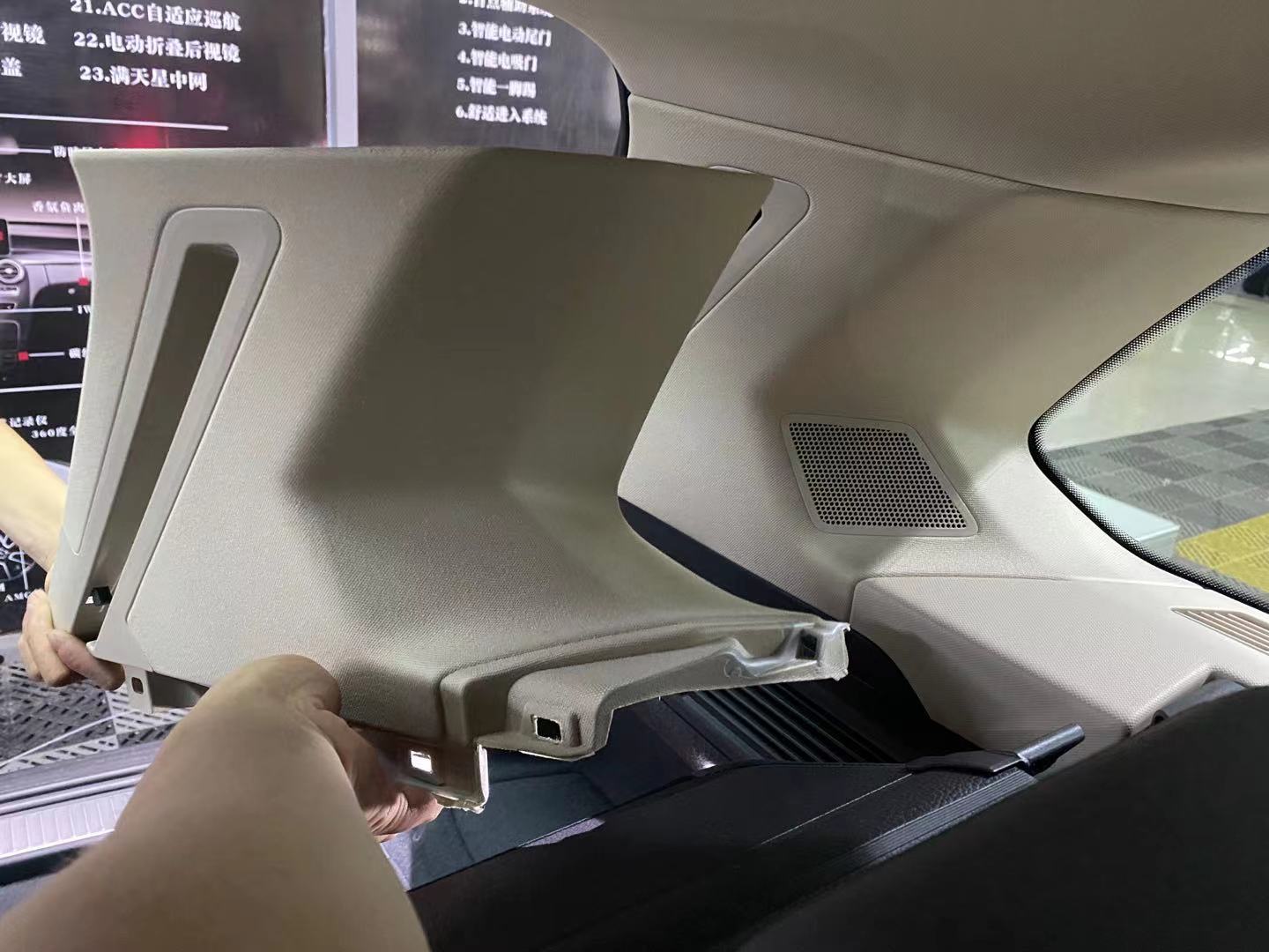 功放在后尾箱的左后侧,也是有原厂预留的固定螺丝位置,A柱和D柱是直接更换饰板的,如果是切割出喇叭出声孔,那真的会很难看!