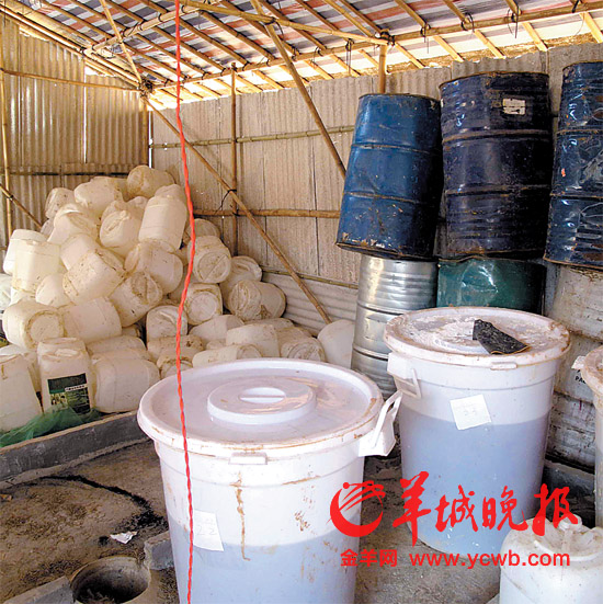 警方调查显示,这个窝点已制造麻黄素多批。11日,警方在现场查获的麻黄素成品就有13公斤,正计划制冰毒。半成品麻黄素简直无法统计,因为几百个桶里都装有制作麻黄素的原材料和已制作的麻黄素溶液!