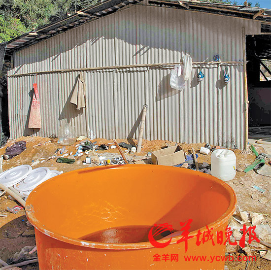 15日,羊城晚报记者来到制毒现场发现,进入制毒现场是条新开辟的泥巴路,在山林间开凿的痕迹十分明显,像是刚开的,不过修得十分平整,一辆小车很容易就能爬上去。走了2.5公里,才走完这条路,见到制毒现场!