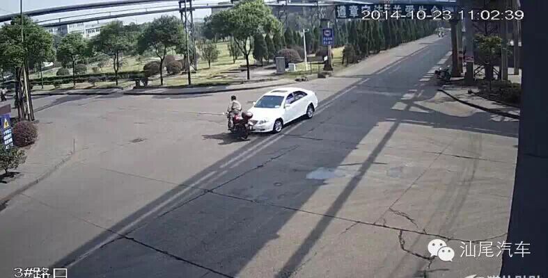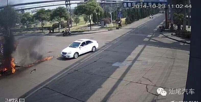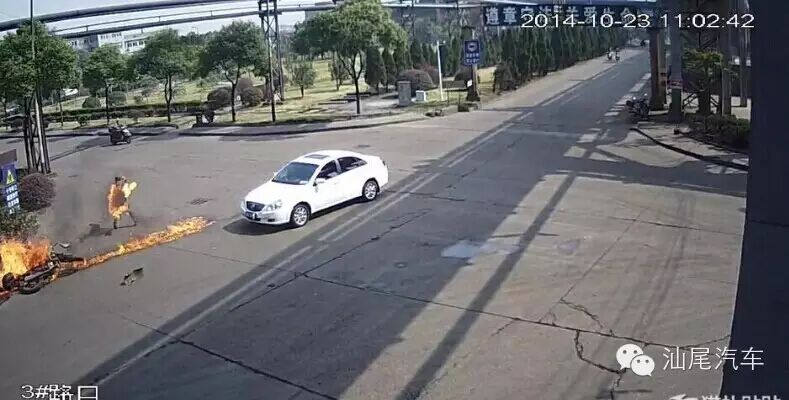 [最新车闻] 摩托车与汽车相撞后漏油 驾驶员瞬间变成"火人"