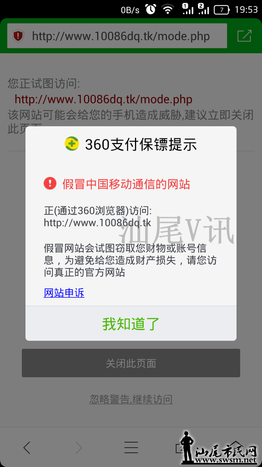 最后是用安卓手机打开,被360检测到了! 快告诉身边的人!千万别中招!多年经验告诉我们,中移动就算有兑换活动他们也不可能转现金!所以遇上好事情要保持冷静谨慎的心态对待!才不会上当受骗!