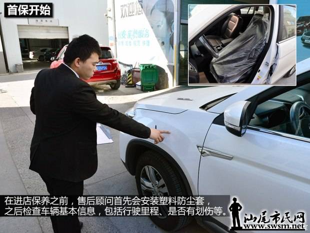 到店第一步是售后顾问登机车辆信息、检查划痕,并安装座椅、方向盘和挡杆的防尘塑料布,这些环节和其它品牌4S店流程基本相同。之后把钥匙交给服务顾问到接待大厅开维修保养单即可。 第一个检验结果:首保只要不超6000公里便可继续享受免费首保