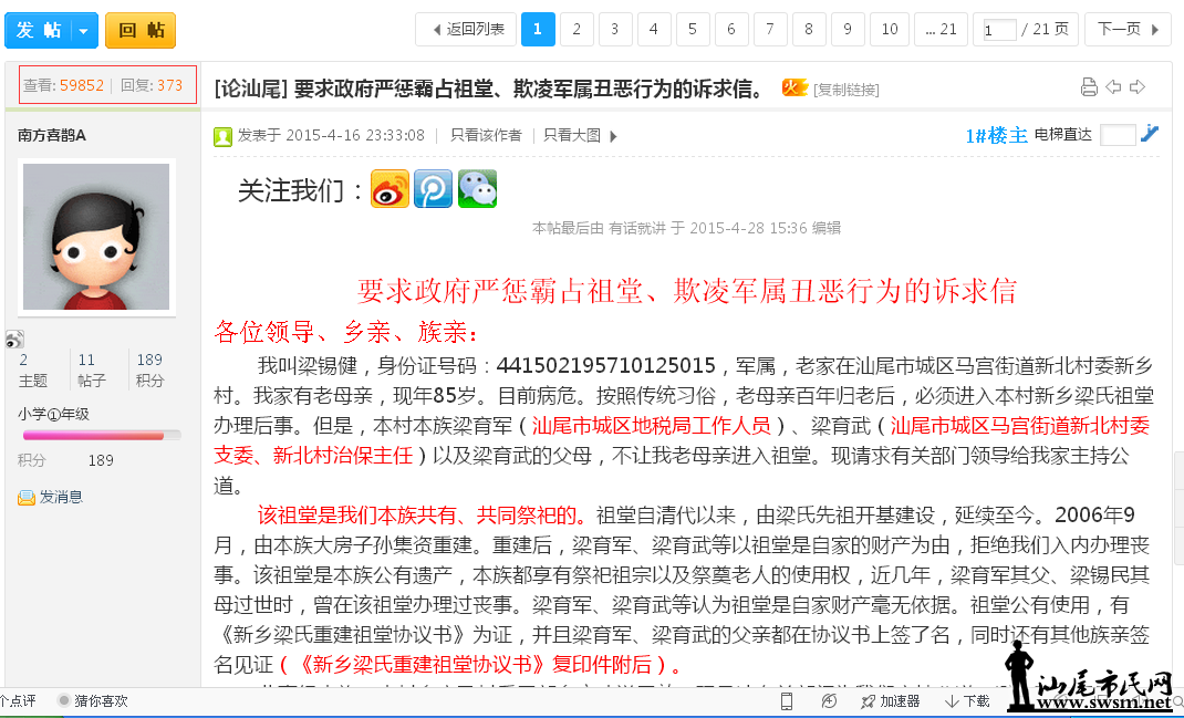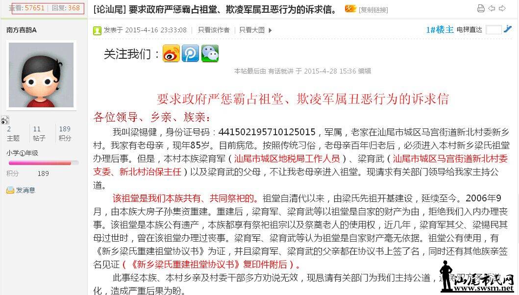 [论汕尾] ID号南方喜鹊及其马甲在市民网利用信息网络实施诽谤一网帖现裁图保留证椐
