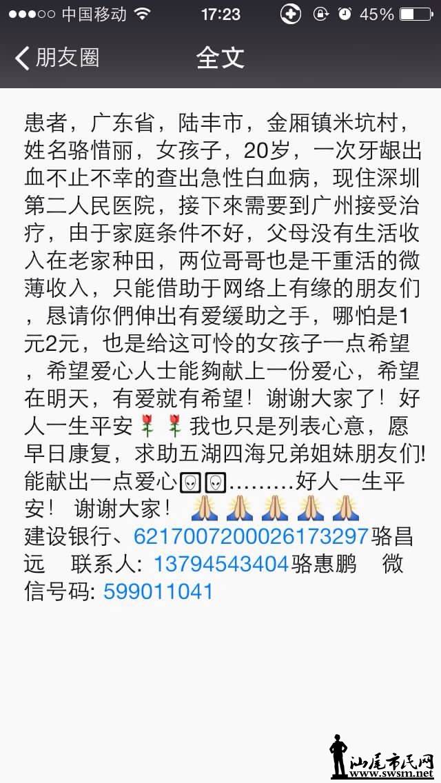 患者,骆惜丽,女,20岁。广东省陆丰市金厢镇米坑村。一次牙龈出血不止,不幸检查出急性白血病。我们无法知晓未来,但我们一直在创造未来。不要让笑容停留在黑暗之中。 “不要让这一声求救成为无声呐喊。让我们为它加大音量。” 图:为患者哥哥发的网络求助信。 患者父母是普通的乡下老实务农人。他们知道医疗费用对他们来说太过沉重,但更不愿意让宝贵的生命走的太轻飘飘。 图为患者的家。 我们知道一个人的能力是有限的,但群众的力量是无限的。不要小看自己的微举,因为爱心本来就会自身发光。而那也是给患者的希望之光。捐款方式:中国建设银行:骆昌远6217007200026173297电话联系人:骆惠鹏(患者哥哥)13794543404微信号:599011041 图为医院检查结果报告。 流式细胞免疫荧光分析结果报告单。 图为患者住院图。