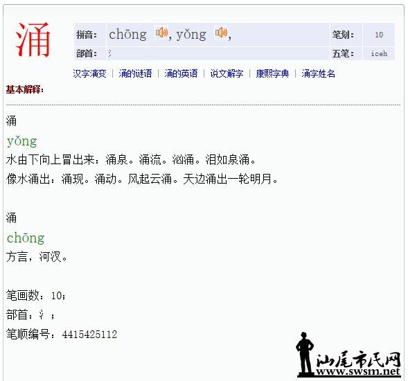 我所说的”yong“的读音是对的,就是针对这个字是对的。这个我们不能说他是错的。但是用在地名,最起码也要尊重汕尾市本地人的读音吧?另外,字典里也有说在”涌“字在用作地名的时候是”chong“。道理跟”曾“字在作为姓氏的时候应该读作”zeng“,而不是象词组”曾经“读”ceng“,但是在汕尾的某些政府部门里,确实有人会读”ceng“,能在政府部门里工作的少说也应该懂点字的,应该是个”读书人“吧?但是象”东涌“写成是”dong yong“的以及作为姓氏的”曾“被读成是”ceng“的,这圣贤书都读到狗肚子里去了。大家说是不是? |