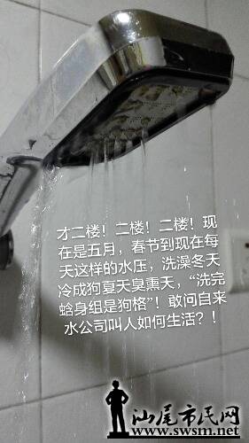 然而,在汕尾近年来的高速发展之下,某自来水公司却与城市发展背道而驰。居住于城区城内路的居民自春节至今三个多月,长达100余天的时间里,长期陷入用水难的艰难局面。每天想洗个澡都不能称心如意,水压低出水小,热水器根本都打不着火,冬天冷成狗夏天臭熏天,这么酷热的天气下班回到家想洗个澡洗干净那是痴心妄想!多次致电自来水公司反映情况都得到不同理由的搪塞,一会儿告诉你这里修水管那里在接管,过两天就好了;一会儿又告诉你水厂在大修,没个一头半个月搞不定;本来答应你派人过来查看的却迟迟未见有人前来过问。这样的用水情况已经持续了三个多月了,现在还在继续,这正常吗?请问自来水公司,到底是怎样的水管让你们修了三个多还没修完?是怎样的水管让你们接了三个多月还没接完?是怎样的大修让你们修了三个多月还没洗完?