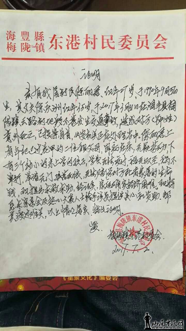 6月30晚本小编收到由汕尾市海丰县梅陇镇爱心人仕陈庆模和陈立义先生转递的求助信,内容如下: