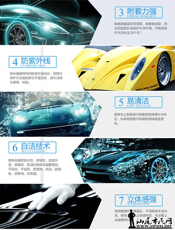 4、易清洗:钻石晶体强大的纤维网会填补车身漆面看不见的细小毛孔,使漆面达到镜面状态,使车身易清洗保养,各种灰尘和各类污物仅使用清水(不加任何洗涤剂)冲洗,车体表面就可恢复和保持晶莹透亮,即使粘有油污或虫尸,只需将湿毛巾直接擦试物体表面就可轻松去除,同时节省洗车量50%以上,同时具有超强的疏水自洁功能。