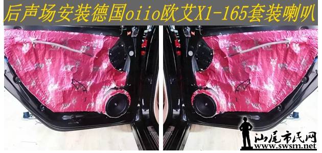 对门板隔音, 车门的隔音处理里外双层要贴上的隔音材料,在车门的两层钢板上分别贴上一层顶级隔音材料,可以起到良好的隔音、制振、密封的多重作用,封闭的车门腔为喇叭提供了一个音箱箱体,使喇叭的性能得到充分发挥,尤其对改善声场的中低频效果作用巨大。