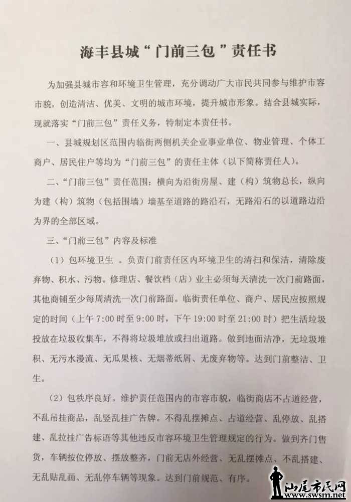 创建文明、卫生城市,全海丰人都来参与。根据县创建卫生县城工作要求,县公用事业局自4月中旬开始,组织力量向全城主次干道、沿街商户、单位业主签订“门前三包”责任书,落实门前环境卫生、经营秩序和绿化管理主体责任。