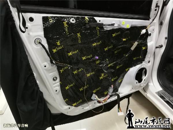 做完之后再将外层门板的隔音贴上,外层隔音必须要注意的事情很多,螺丝孔、卡扣孔、各种线束必须露出来,然后隔音的边缘必须与门板内饰的边缘轮廓线平齐,最后压紧,将门板的大致轮廓压出,显得美观。
