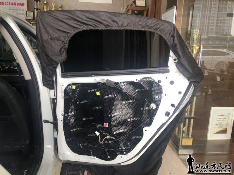 车门隔音处理,山水隔音止振材料,双层隔音处理让钣金变得更加扎实密封。 这是新思域原车门内部构造,钣金比较薄,而且没有进行隔音处理。共振噪音和风噪问题比较突出,因此在进行音响升级过程之前,先把噪音问题解决了。使用山水隔音材料对汽车门板做第一层的隔音处理,降低门板共振噪声