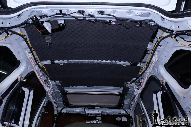 不同的噪音产生于不同的部位,为了能够有效地解决噪音问题,针对车底盘和后尾箱和车顶棚进行隔音处理,可以有效减小钣金共振噪音;首先是贴一层减振材料,提高钣金刚性、减小共振噪音。之后再贴一层隔音隔热垫,让低频共鸣声和路噪得到有效削减,从而使得驾乘环境变得更加安静舒适。