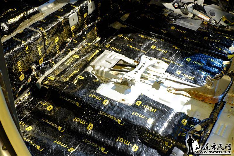 底盘隔音是隔音升级工程,这里是很容易受到路噪的侵袭,在拆除座椅之后发现,原车的底盘隔音极其欠缺,因此我们先使用中道Q-mat隔音对汽车的底盘做了止振处理,然后使用隔音隔热垫对汽车的底盘做了第二层的密封处理,双层的隔音处理能更加有效的增强钣金刚性,同时减少了低频噪音的入侵。