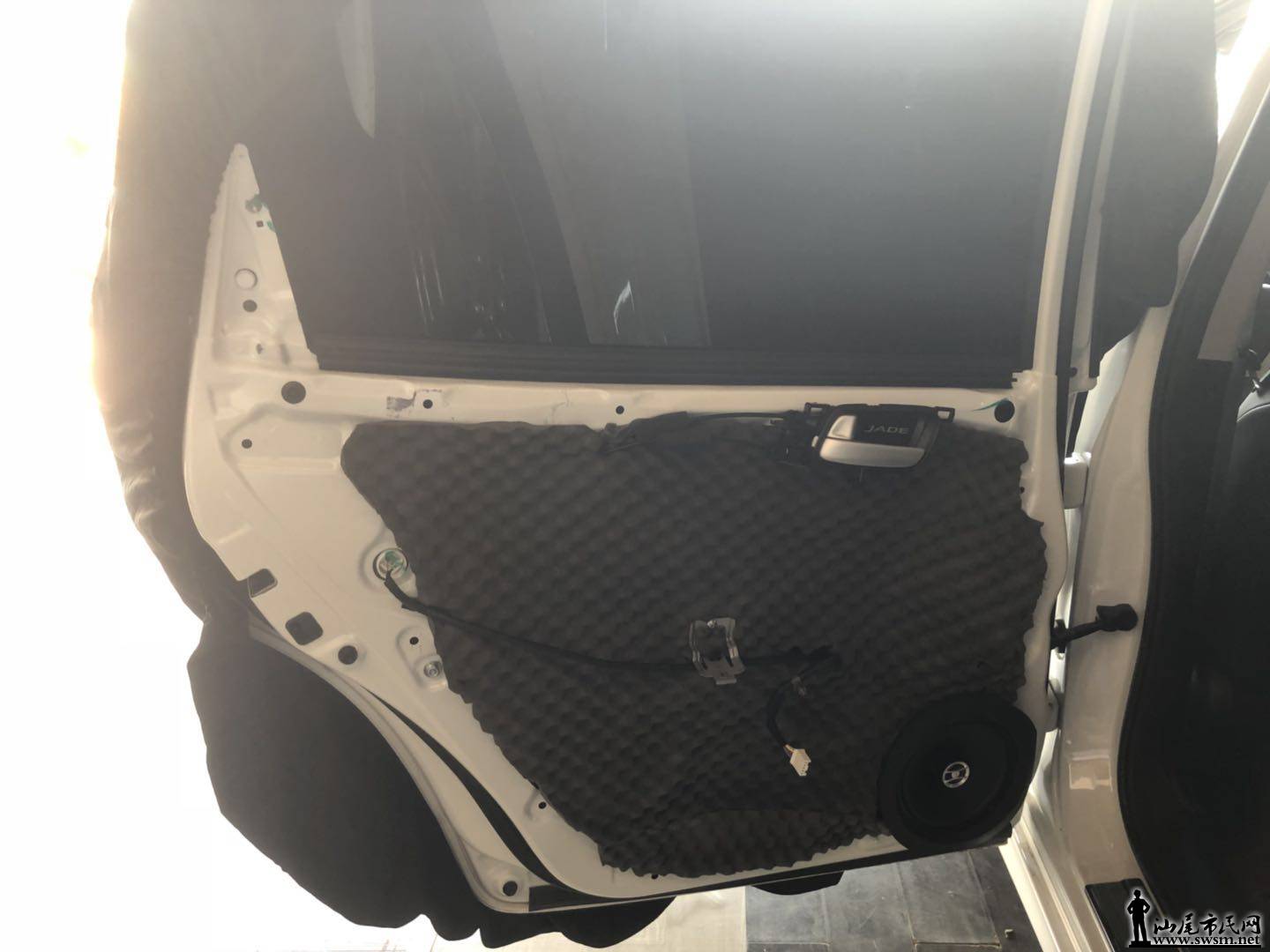 杰德加强型四门板隔音效果,这样不但可以有效的降低噪音,让驾驶者得到更加舒适宁静的聆听环境,同时门板隔音具有“音箱箱体效应”,可以让安装在车门上的喇叭得到更好的音质效果。为了有一个更加好的隔音效果,使用山水对门板内外做了细致的隔音处理,进行了双层隔音,防止喇叭传出来的声音受到音染从而降低音乐的音质效果。