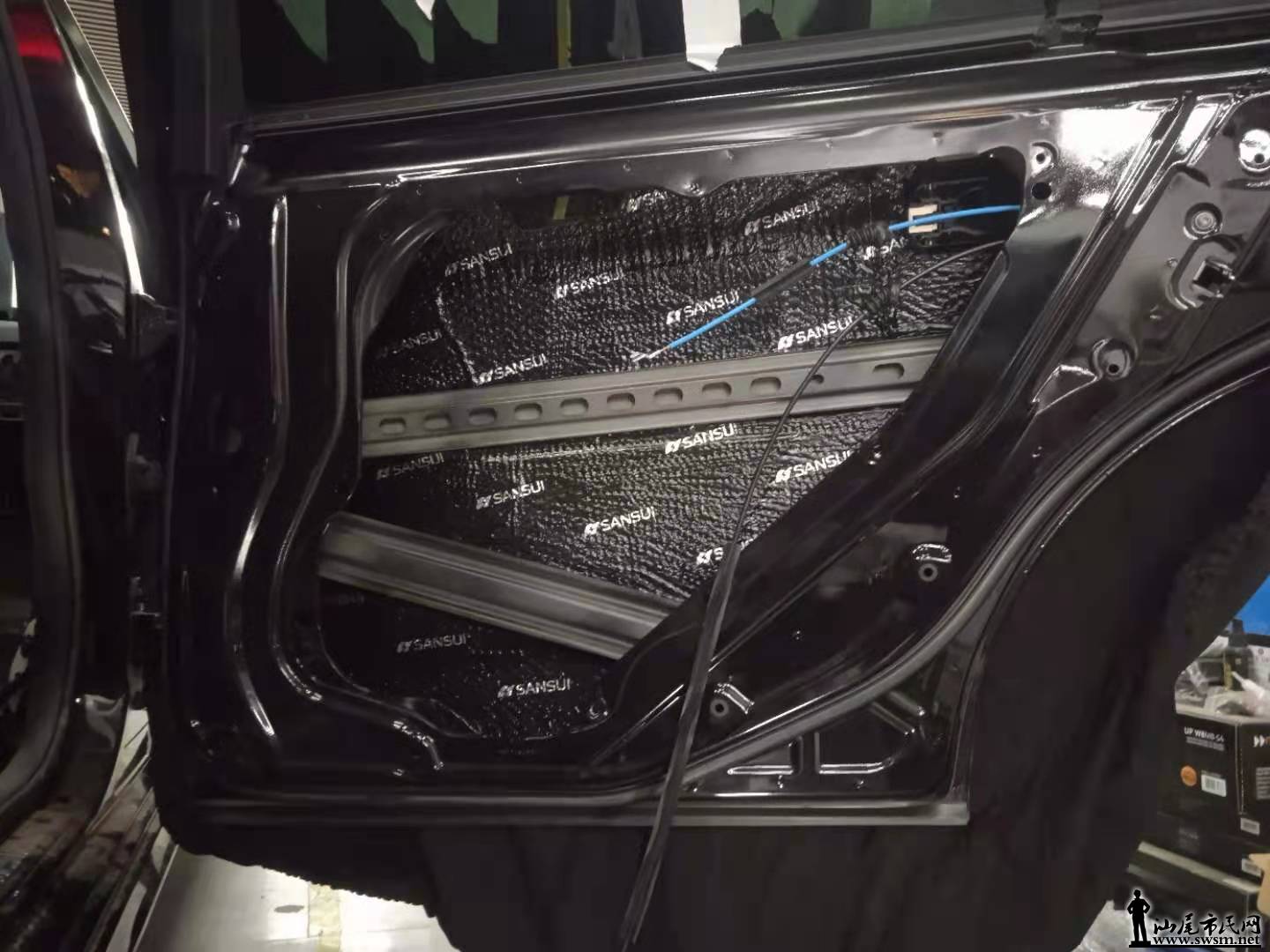 门板内衬板设计简单,没有加装任何隔音降噪措施,将门板内衬板清洗干净。门板内衬板满贴山水隔音减震板,形成密闭的箱体空间,有效的减少风噪的传入,更好的保护车厢舒适环境。