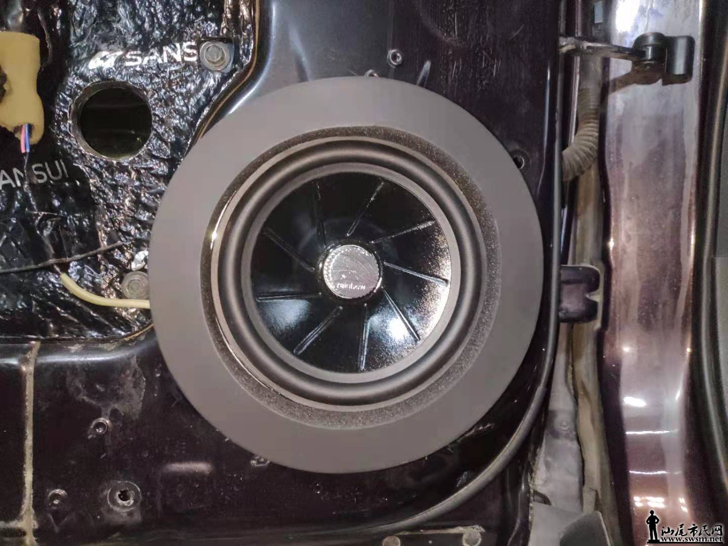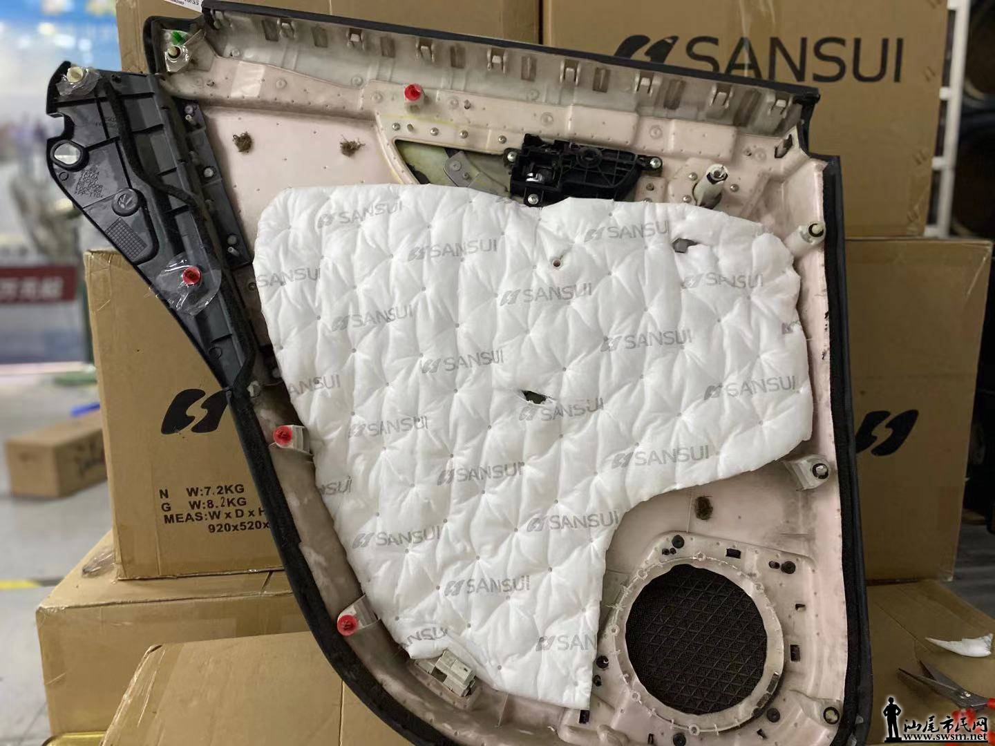 改装师首先对原车的门板进行了拆卸,发现原车门板的隔音措施非常简陋,密封性不好。所以改装师首先使用了山水隔音材料对汽车四门板进行了隔音处理,有效的抑制了噪音的产生和传递。原车门板并未做有效的隔音措施,只有一层单薄的钣金结构,第一层隔音在里层钣金粘贴山水减振板,增强钣金厚度。