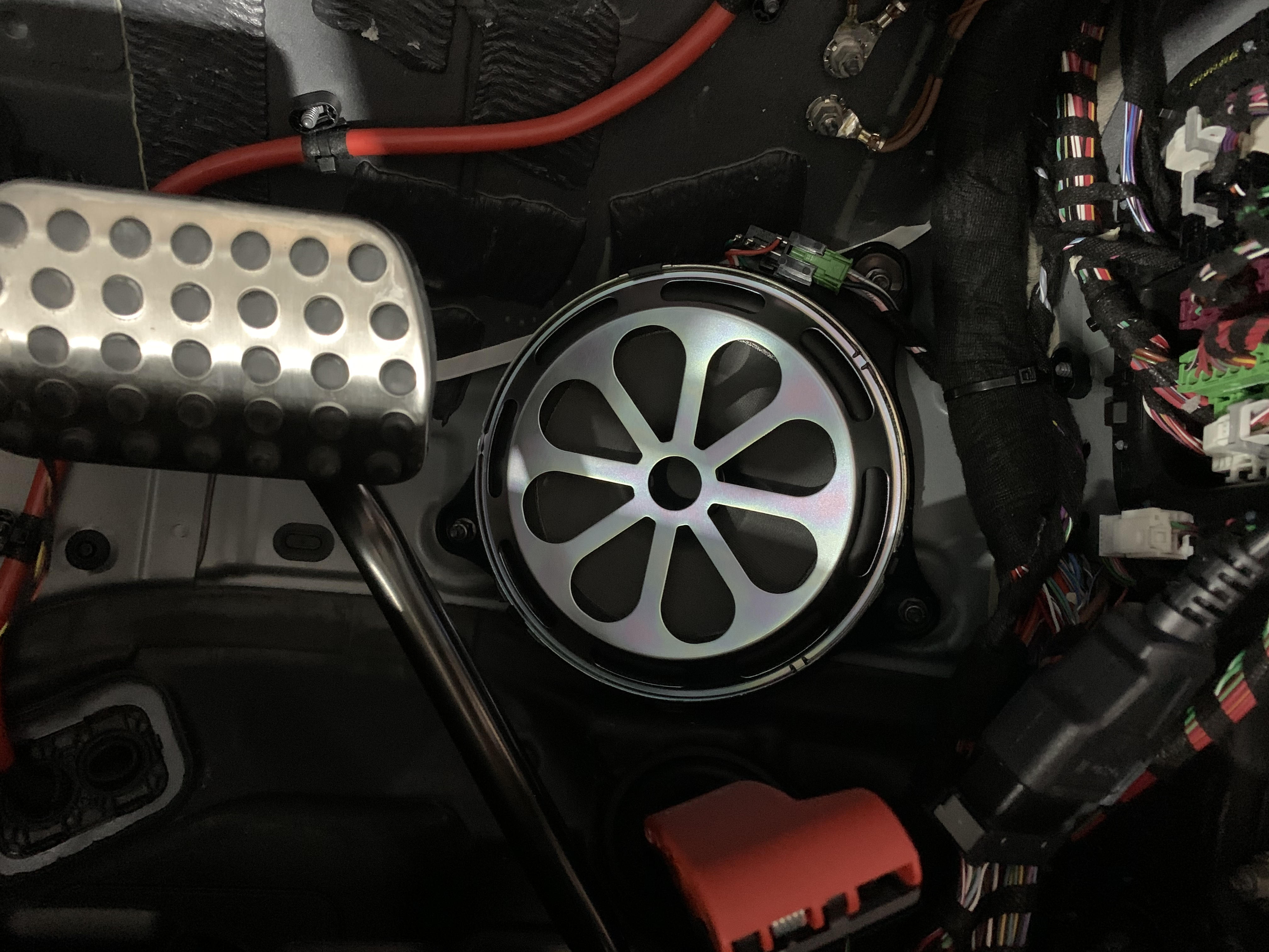 在主副驾驶位的地毯下方各有一个低音喇叭,看似与小柏林差不多,实际上差的可不仅仅是一点点!