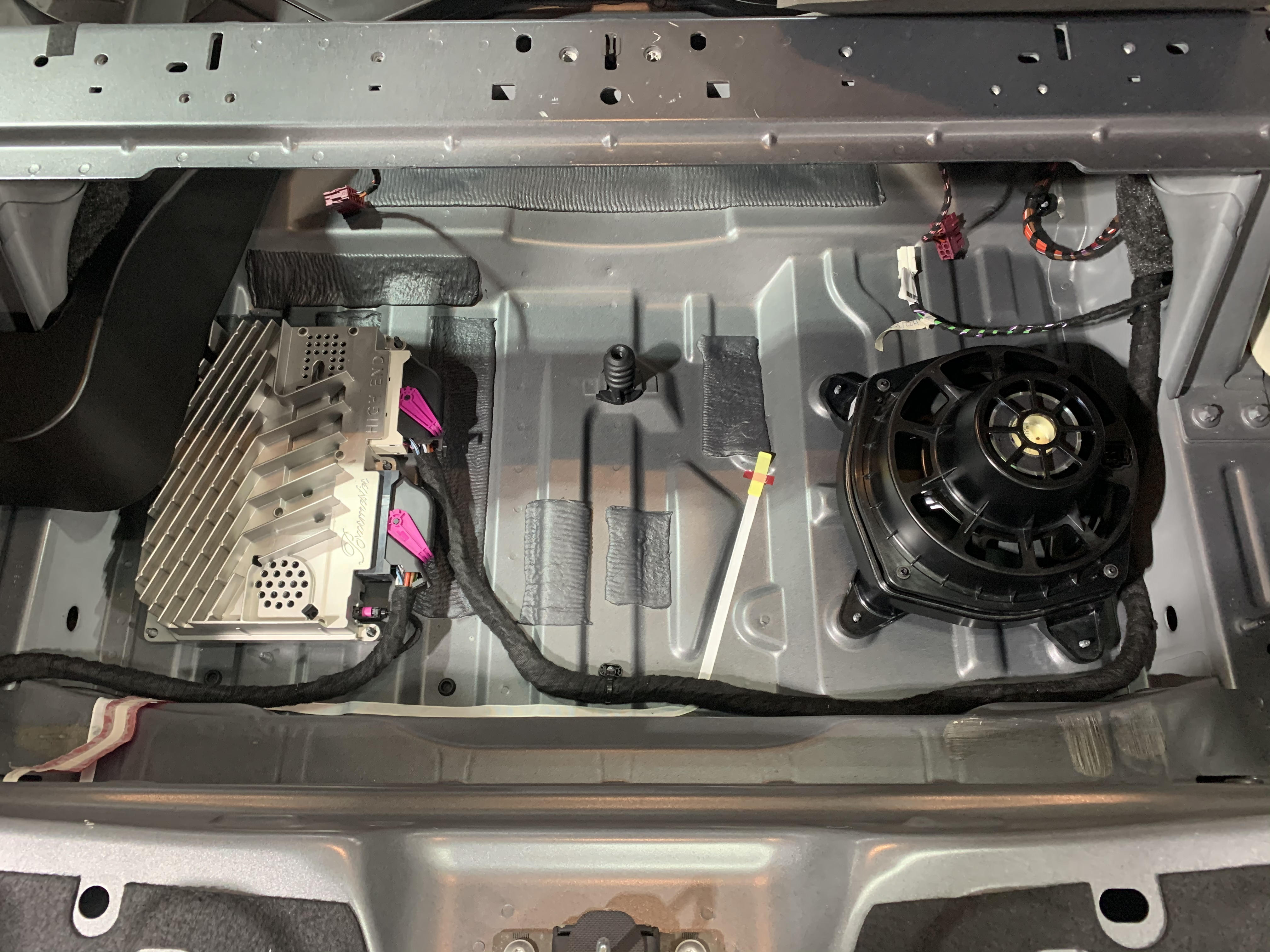 在后排左右两侧都各配备了环绕中音和高音,比较重磅的低音炮和功放安装在后尾箱的备胎处,按照原厂的标准,带有大柏林的GLS备胎是不会放在这里面的,而是有一个支架直接放置在后尾箱处,当然你也可以选择不携带备胎出行!