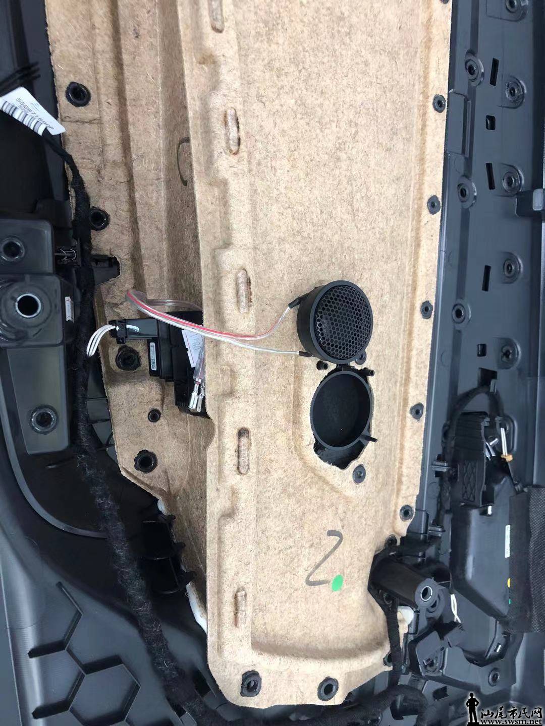 汽车音响改装前为了使汽车音响效果得到更好的发挥,首先要对四门进行汽车隔音降噪改装,原车门板直接露出钣金,没有任何的隔音材料。 门板汽车隔音第一层,内层贴山水减震板,有效的抑制钣金共振。