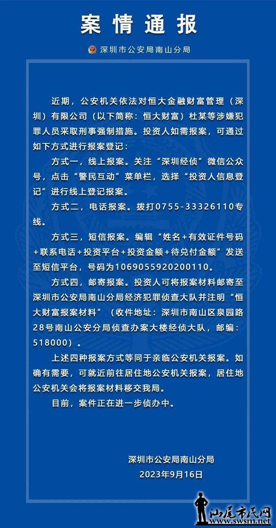 据深圳公安局南山分局官方公众号9月16日晚消息,近期,公安机关依法对恒大金融财富管理深圳) 有限公司 (以下简称 : 恒大财富) 杜某等涉嫌犯罪人员采取刑事强制措施。投资人如需报案,可通过如下方式进行报案登记: