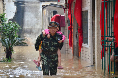 在救灾现场,强降雨导致多个小区进出路段被淹,水最深处漫过腰际,冲锋舟也无法运行。武警官兵跳进湍急的洪水,推着冲锋舟一步一步向前,把数十名遇险群众转移到冲锋舟上。在搜寻转移群众时,有两名小孩被洪水围困在家,副支队长黄建雄当即就背起两个小孩,将其送至安全地带。