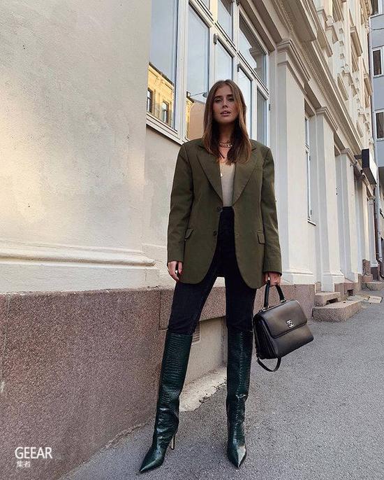 为了平衡视觉上的轻重感觉,可以利用oversized 外套带出鲜明的对比,从而加强紧身牛仔裤明显的显瘦效果。 4。及膝/过膝长靴