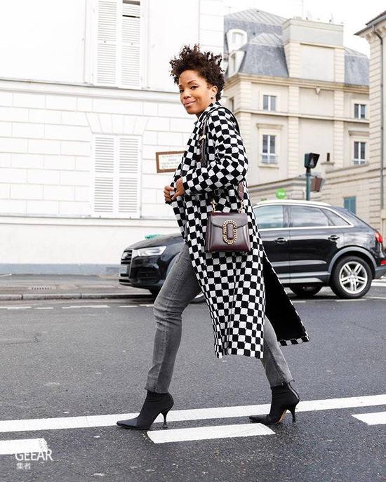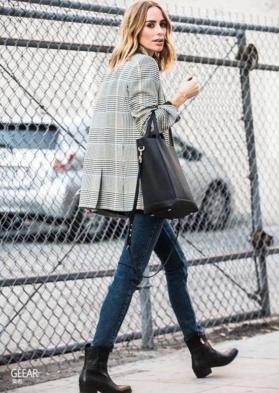 素色的紧身牛仔裤低调朴素,不少人都喜欢以随性的T-shirt作配搭,这时候只要加上一件格纹西装外套衬托,造型便瞬间变得时尚亮眼! 2。黑色踝靴