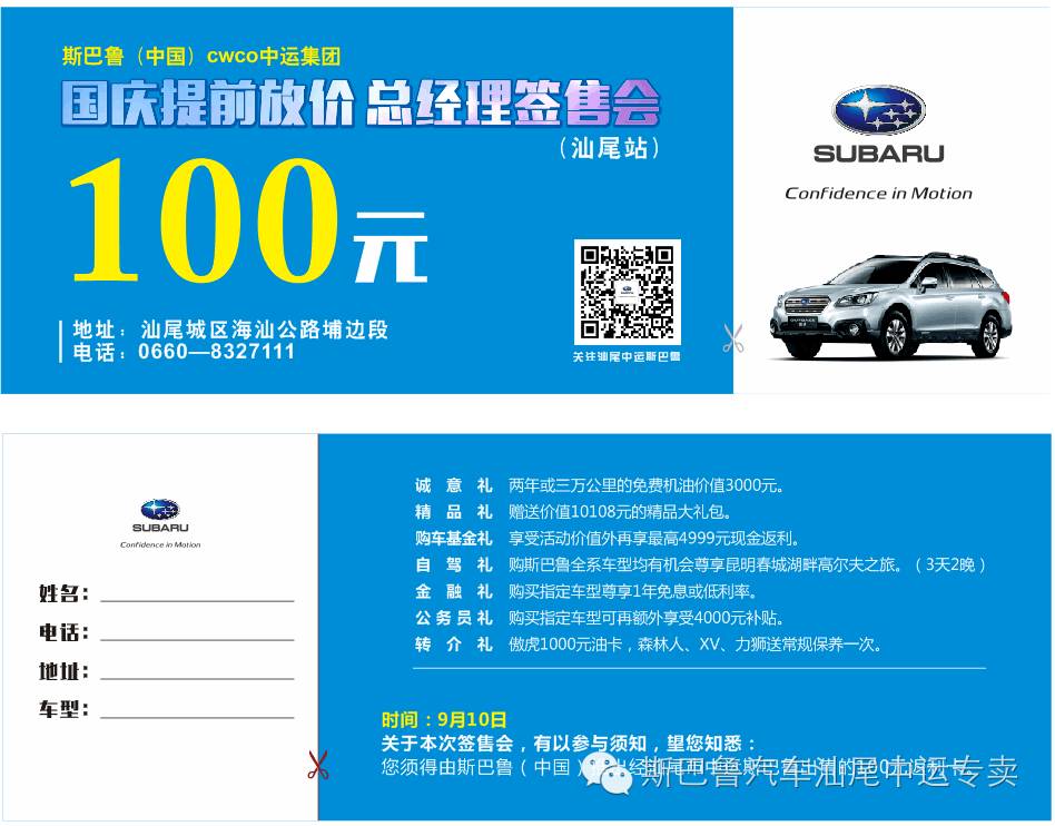 活动主题:国庆提前放价--斯巴鲁厂家授权-总经理签售会(汕尾站)