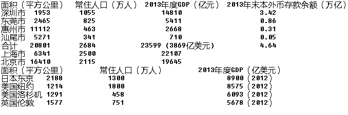 7、深圳市的各项存款余额超过30000亿元,东莞市的各项存款余额超过8600亿元,惠州市的各项存款余额超过3000亿元,汕尾市的各项存款余额超过500亿元,珠东都2013年末的各项存款余额超过4.64万亿元,如果用活这笔资金,就会迎来又一次高速发展。 8、珠东都不仅要成为亚太的金融中心,还要成为世界的科技中心、国际物流中心等等。 9、珠东都的东莞、惠州、汕尾都采用深圳市的特区政策,珠东都就是扩大版的深圳特区,逐步升级成为直辖市。