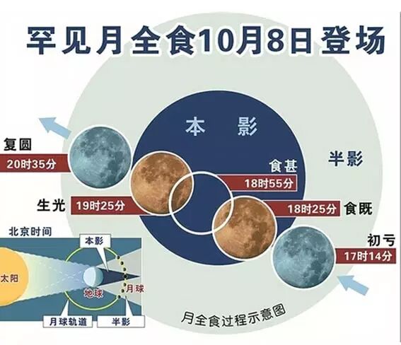 本次月食的过程可经历2至3个小时,主要包括初亏、食既、食甚、生光和复圆五个阶段。此次月食开始时间为今日17时14分,复圆时刻为20时35分,“带食而升”将是月全食一大亮点,即当月亮升起时,已经被“天狗”咬了一口。而最精彩的全食阶段(食既到生光),将从今日18时25分开始,持续近1小时。