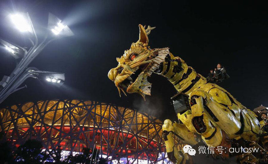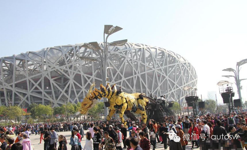 10月17日,为纪念中法建交50周年,北京国家体育场“鸟巢”上演神兽“龙马”“蜘蛛”大巡演活动。活动分为三天,八幕展开,每一幕表演1.5小时。第一天为“苏醒”,龙马和巨型蜘蛛分别现身;第二天为“对抗”,龙马寻找蜘蛛,蜘蛛为龙马布下陷阱,两个神兽激战;第三天为“和解”,龙马救出了深陷自己布下陷阱的蜘蛛,蜘蛛被感化成为龙马的朋友,大地恢复平衡。 “龙马”大型机械装置是取自中国成语“龙马精神”的神兽,“龙马”运用了中国文化元素,根据中国古代传说故事演绎创作。“龙头马身”的“龙马”大型机械装置长17米,马背置亭高度15米,展开的翅膀宽度16米,重47吨,使用最先进的自动化控制系统和电子设备控制,它可以行走、腾跃。“蜘蛛”高5.7米,宽6米,重37吨,行进时高度13米,身体完全展开的跨度达20米。 超级炫酷有木有!好想看!