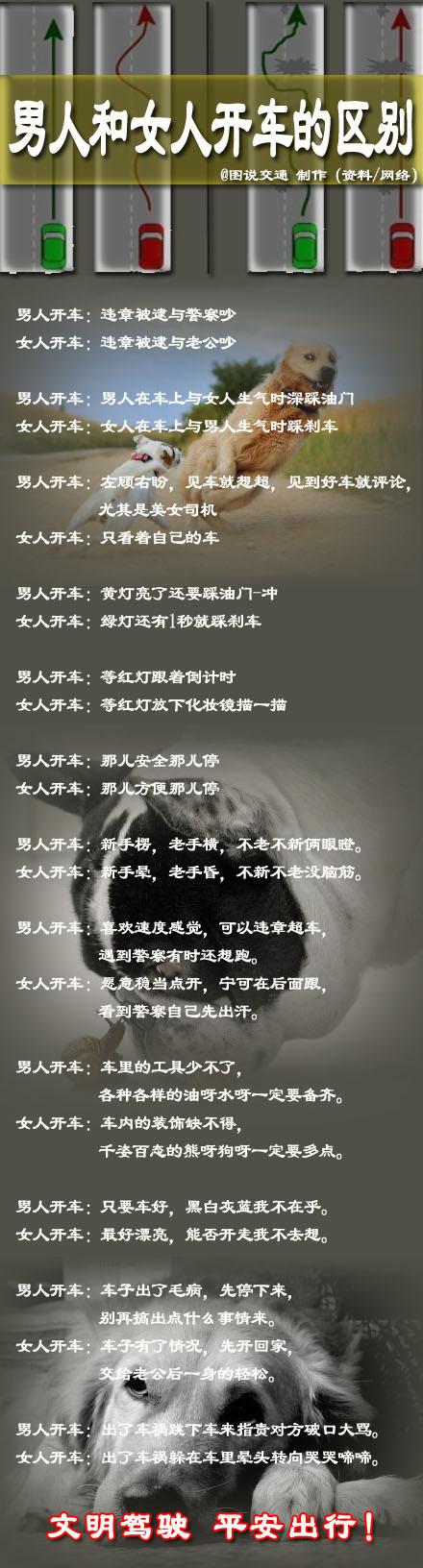 男人和女人由于性情、习惯以及身体条件的差异,在开车这一问题上有着比较明显的区别。通过比较不难看出,在开车中以及对待开车中遇到的特殊情况,各有各的优缺点,如能发现短板善加克服,开车上路那必定是妥妥滴