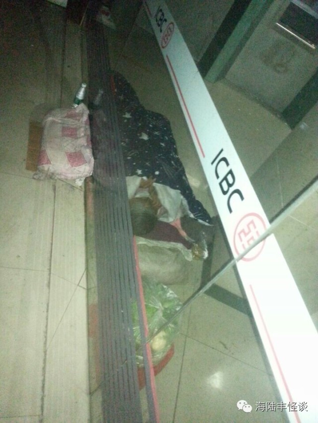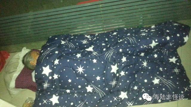在彭湃中学旁边那工商银行自动取款机的房间里,有一个长年在那居住的流浪老人,记得刚入冬天时,我就给她送过两张新棉被,后来又送了两件热心人士捐献的外套大衣。可是这几天在那里经过时,看到老人家身上又只穿着一件单薄的衣服。我今晚去三角站送了三张棉被后,开车回家的路上打了几个冷战。我心里在想,自己穿着外套被风这么一吹在身上都觉得很冷,那自动取款机房间里的老人不是更冷吗!于是掉头再去拿一张棉被去看看老人的情况。我走进工商银行自动取款机的房间后,看到老人家身上只盖了一张很薄的床单,这两天的天气已经很冷了,而且还下着小雨,而老人身上只盖很薄的床单,蜷缩在自动取款机房间的地上。只要还是个人都会看不下去的,但我也只能叹息一声走了过去,心里非常难受也不敢多看,将带去的棉被给老人家盖上。