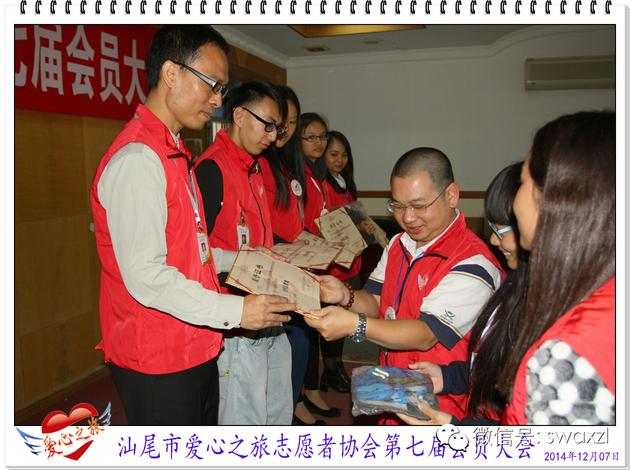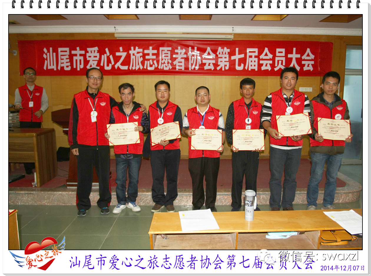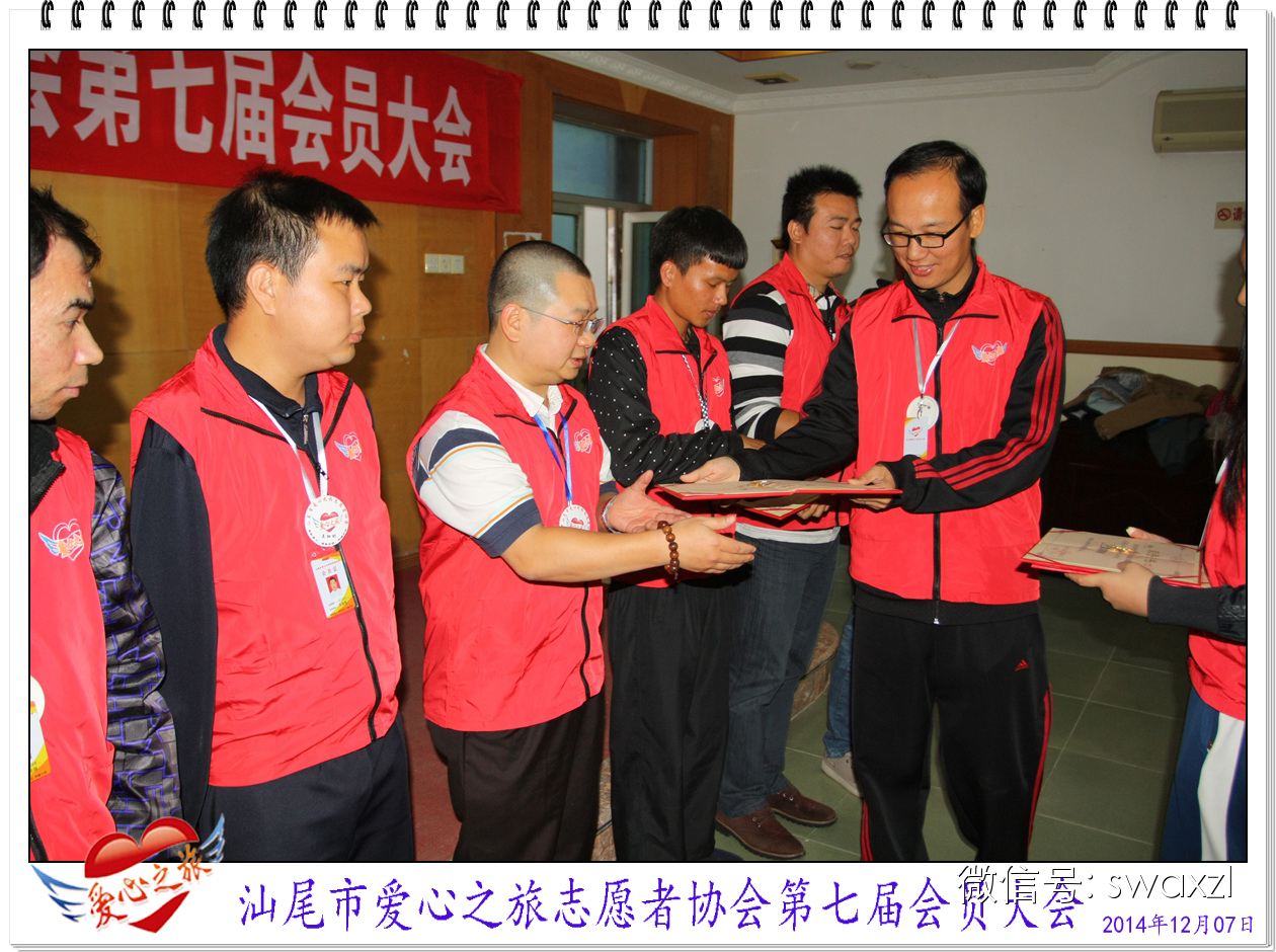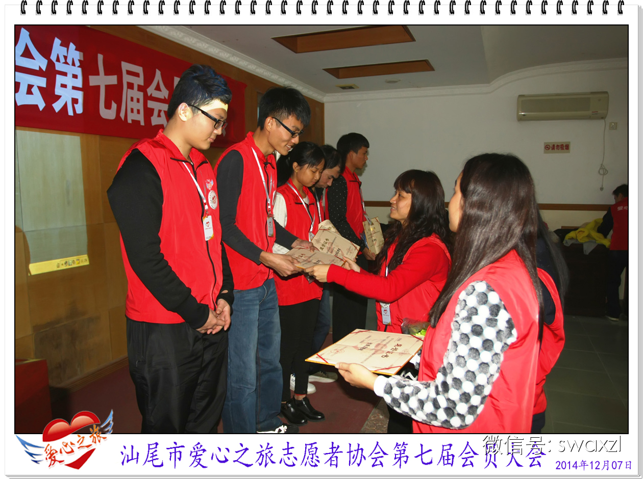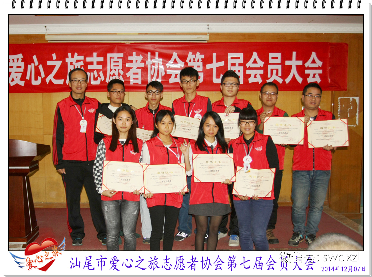 2014年12月7日,爱心之旅如期召开了第七届会员大会,与往年不同的是,本届大会除了会长作年度工作总结报告及发展目标、小组及项目负责人工作报告、年度优秀会员表彰及星级志愿者表彰等外、还增加了场外会员寄语、会员及爱心志愿者的文艺表演等内容,让大家体验了一次别开生面的会员盛会及“家”的温馨。