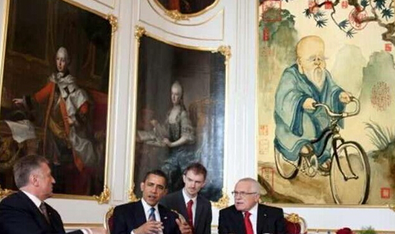 传世名作《彭祖骑车图》轰动世界 ---作者 许永雄 《彭祖骑车图》曾经专门由历代帝王秘密收藏,从不外传。到清代收藏在圆明园,后被八国联军窃走。两年前突然出现在白宫会议室,俄国总统普京也专门请人复制了一幅小型张放在自己的办公室,以便日日欣赏,并祈福高寿。