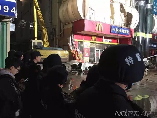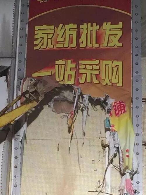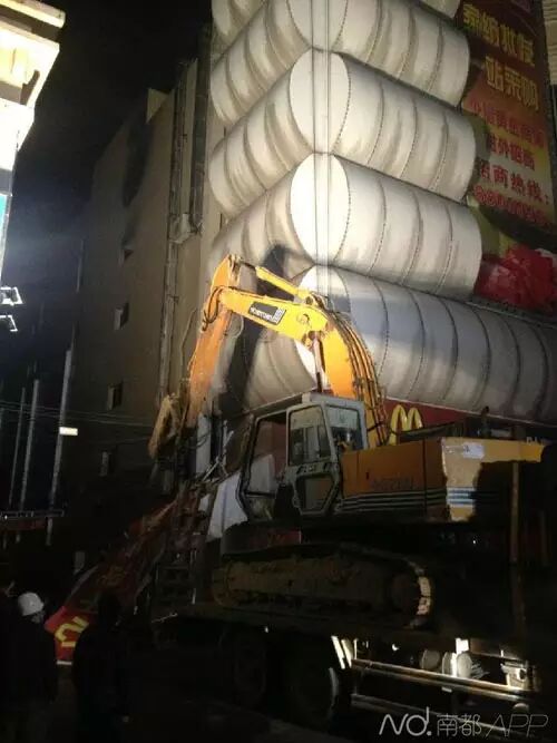 18:56 挖掘机进入大楼西侧计划砸4楼墙体