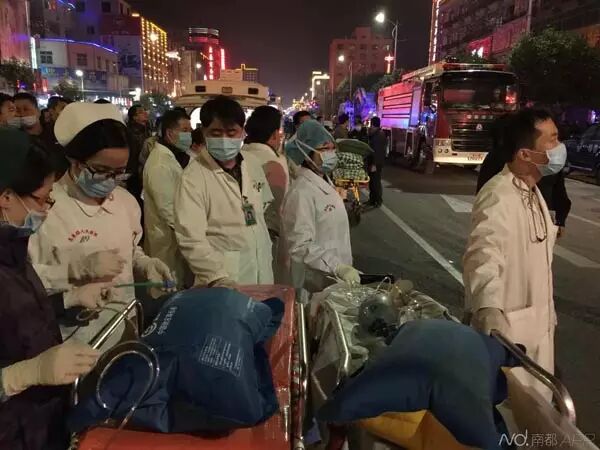 5:06 现场进行清场。南都记者看到,已经有遇难者被抬上担架