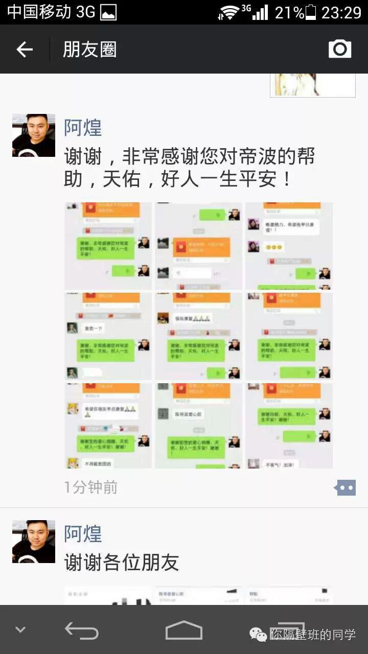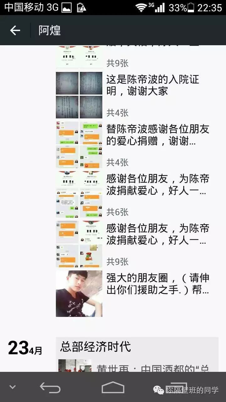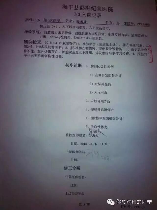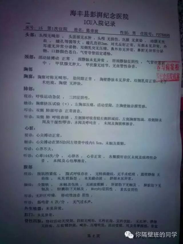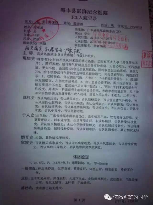 黄羌中学初三(5)班的陈帝波同学,黄羌林场十字岗人,因2015年4月25日晚上从朝阳水库排洪渠错足摔伤,非常严重!手骨、脚骨都断了,屁股的骨头断了,双肺损伤,伴左侧血气胸,其中左侧3根插到了肺,7-9根肋骨骨折,腰2椎体左侧横突,左侧股骨颈骨折,病情比想象中还要严重,现仍在彭湃医院的重病房ICU里面急救,入院以来,未进食!至今人昏迷不醒。