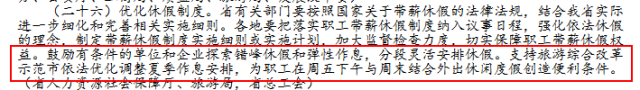 2015年8月,国务院办公厅下发《关于进一步促进旅游投资和消费的若干意见》,明确提出“鼓励弹性作息”,规定除“鼓励错峰休假”外,有条件的地方和单位可以“优化调整夏季作息安排,为职工周五下午与周末结合外出休闲度假创造有利条件。”